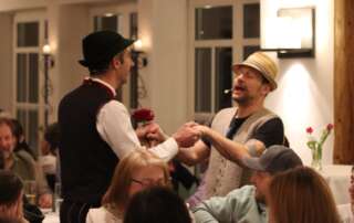Das Theaterstück wird in drei Gängen serviert: Während Vorspeise, Hauptgang und Nachspeise genossen werden, sorgen Spielszenen vor, zwischen und nach den Gängen für Lachen, Staunen und Schmunzeln.